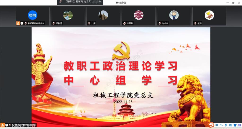 11月25日,机械工程公司党总支召开11月中心组学习会议,会议采用线上方式进行。会议由孙茉莉书记主持。机械工程公司党总支中心组成员参加会议。会议主要学习了《习近平总书记重要讲话精神:高举中国特色社会主义伟大旗帜为全面建设》《习近平在瞻仰延安革命纪念地时强调弘扬伟大建党精神和延安精神为实现党的二十大提出的目标任务而团结奋斗》《习近平给中国航空工业集团沈飞“罗阳青年突击队”队员们的回信》《中共中央政治局常务委员会召开会议 听取新冠肺炎疫情防控工作汇报 研究部署进一步优化防控工作的二十条措施》;学习了“双重组织生活”等学习文件:《关于进一步规范和落实党员领导干部“双重组织生活”制度的通知》、《关于校院两级党员领导干部落实党支部工作联系点制度的通知》《关于加强和改进高公司党支部建设的意见》《中共陕西省委组织部关于建立党委(党组)书记党支部工作联系点制度的通知》《关于进一步加强党支部标准规范化建设的指导意见》。交流学习环节,李逸仙、李玲同志,主要以二十大学习为主题进行了心得分享。王永锋经理以“深入学习贯彻党的二十大精神,推进公司十四五发展规划落地见效”为题,做了公司十四五工作规划总结分享学习。