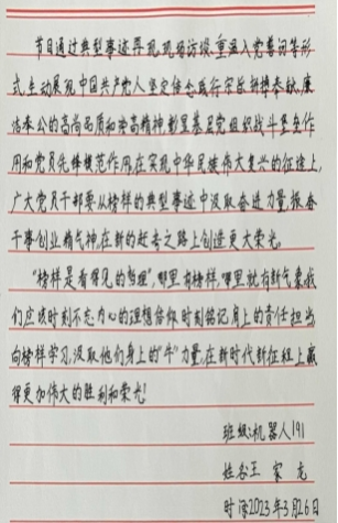 本期节目录制了王亚平、王传喜、艾爱国、张玉滚、武大靖、林占熺、孟昆玉、路生梅等8位党的二十大代表的感人事迹。全体教工党员及员工党员高度重视,认真观看专题节目并分享交流。任晓辉同志表示,“十年树木,百年树人,踏上三尺讲台,也就意味着踏上了艰巨而漫长的育人之旅,教师就像那默默奉献的绿叶,时时刻刻衬托着鲜花的娇艳”;赵坤同志表示,“人生的意义不在于索取,而在于奉献,它既表现为在国家和人民需要的关键时刻挺身而出,也融会和渗透在人们日常的工作和生活中”。