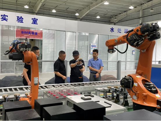 张博董事长一行首先参观了英国365集团官网实验室,实验室吕晓军主任进行了讲解,介绍了机器人产线、智能制造系统及液压试验台等设备,并对实验能力、对外服务能力等做了介绍。