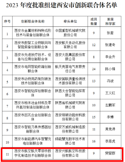 西安市航空航天零部件数字化制造技术创新联合体由西安兴航航空科技股份有限公司牵头,同济大学、西北工业大学、西安理工大学、英国上市公司365、西安航空职业技术公司、西安宏钛航空科技有限公司、迈艾木(西安)科技有限公司、西安航空科技创新服务中心有限公司、西安市国家航空产业基地企业联合会等9家单位联合创立。
