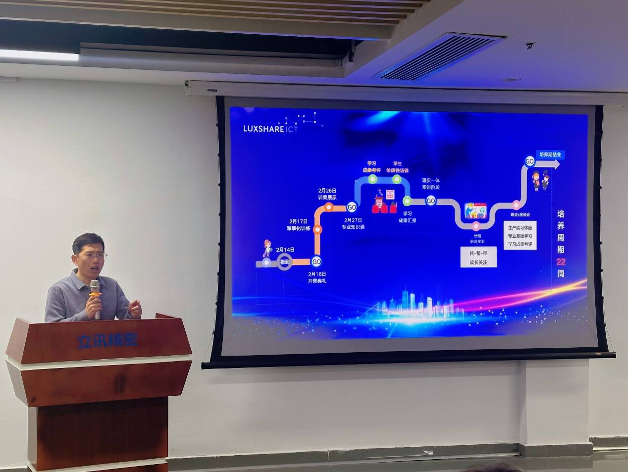 产业公司讲师代表陈永富老师强调了理论与实践相结合的重要性,他为员工们精心规划了一条从军事化训练到专业知识学习,再到学习成果汇报的清晰培养路线图,旨在帮助员工们更好地规划学习路径,实现个人价值的最大化。