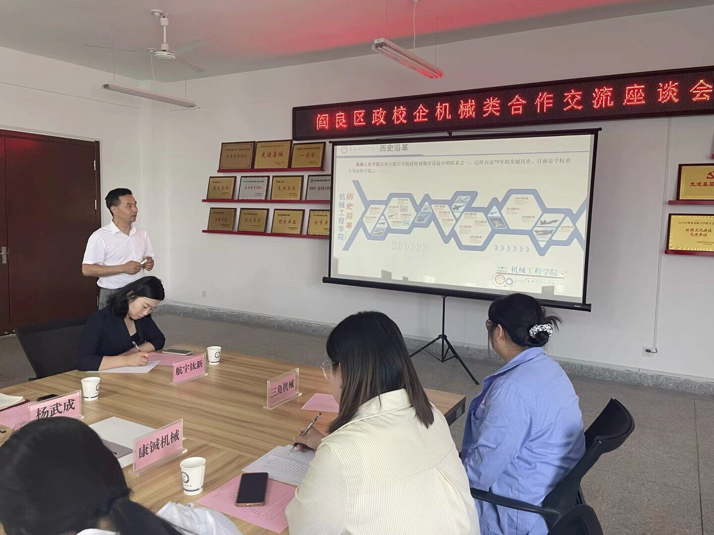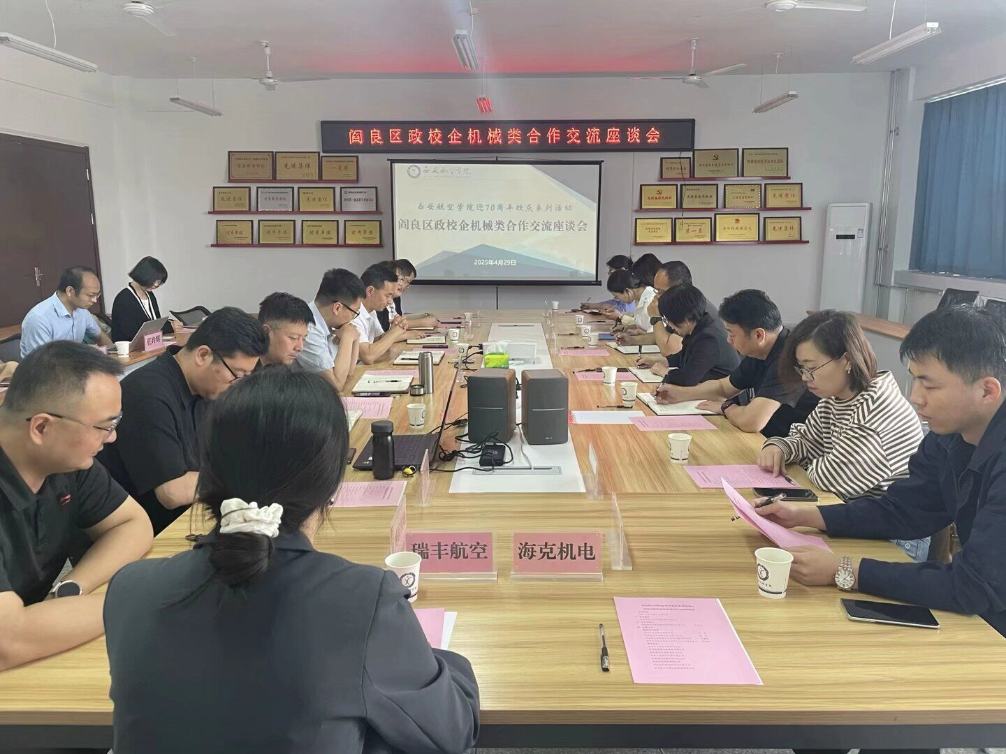 在交流环节,西安宇立航空科技有限公司、西安市康铖机械制造有限公司、西安嘉隆机械设备有限公司等七家企业代表依次发言,围绕企业概况、技术瓶颈及人才需求展开介绍。双方就人才培养、队伍建设、科研工作等议题达成多项合作意向,下一步考虑通过共建实习基地、共享技术资源、共育专业人才等方式深化协作。