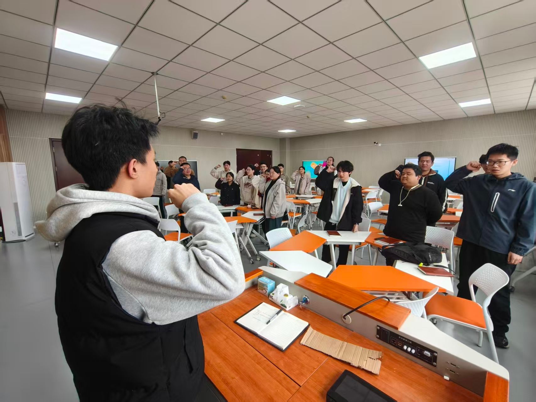 答疑环节结束后,全体考研学子肃然起立,在员工代表的带领下郑重宣誓:“坚定目标,锚定理想院校,不畏竞争,不惧挑战;科学备考,脚踏实地;永不言弃,直面困难挫折,保持韧性,坚持到底!考研必胜!”。誓言铿锵,充分展现了车辆工程公司考研学子的昂扬斗志与必胜信念。大会最后,周小勇代表公司为在场员工发放纪念品。