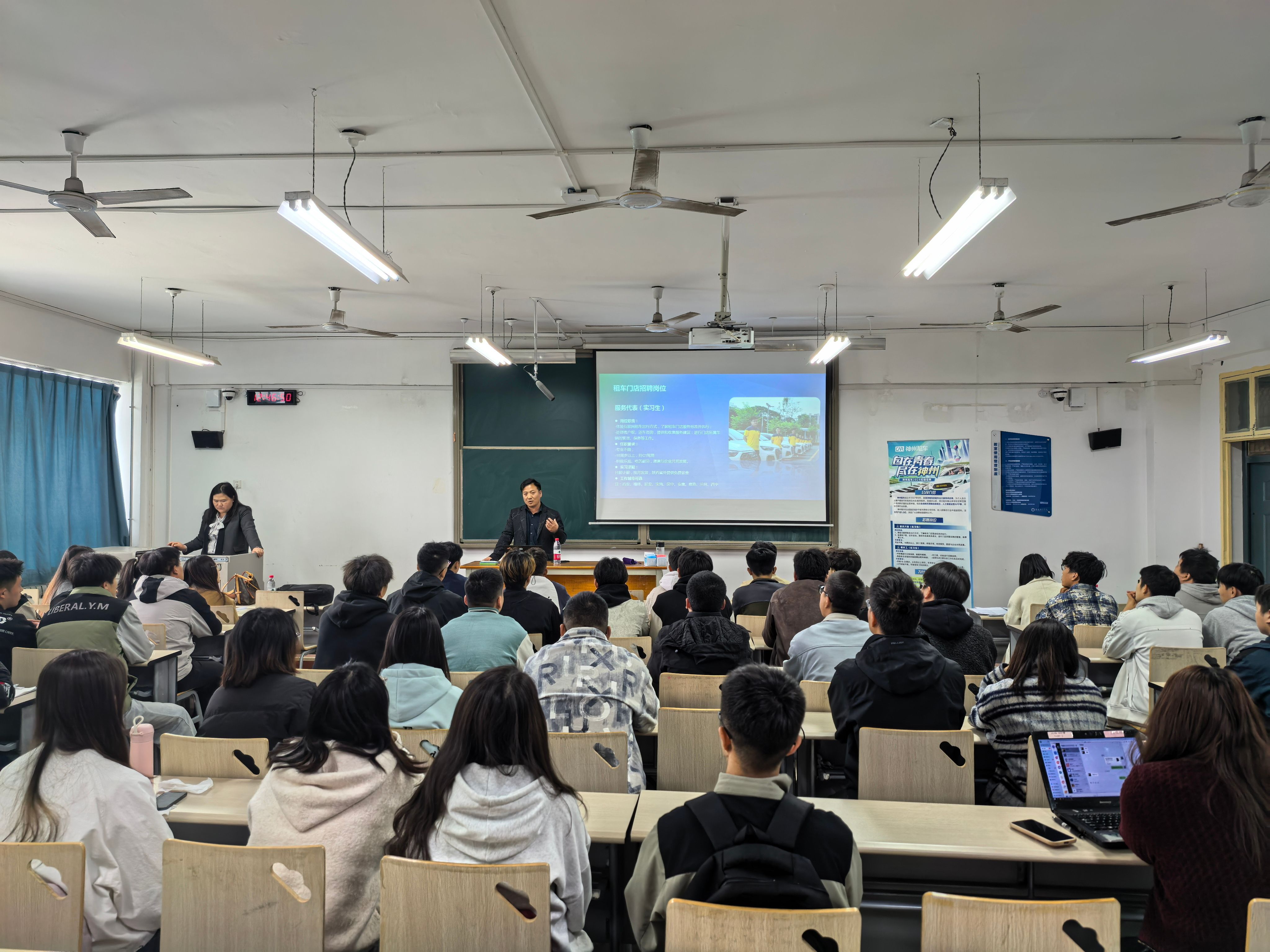 为深入贯彻落实教育部关于高校毕业生就业工作的决策部署,扎实推进公司2025年度“13810”工作思路有效落实,推动人才供需精准对接,2025年3月28日,神州汽车租赁有限公司西安分公司在阎教D1324教室召开专场宣讲会,公司大三员工参加。