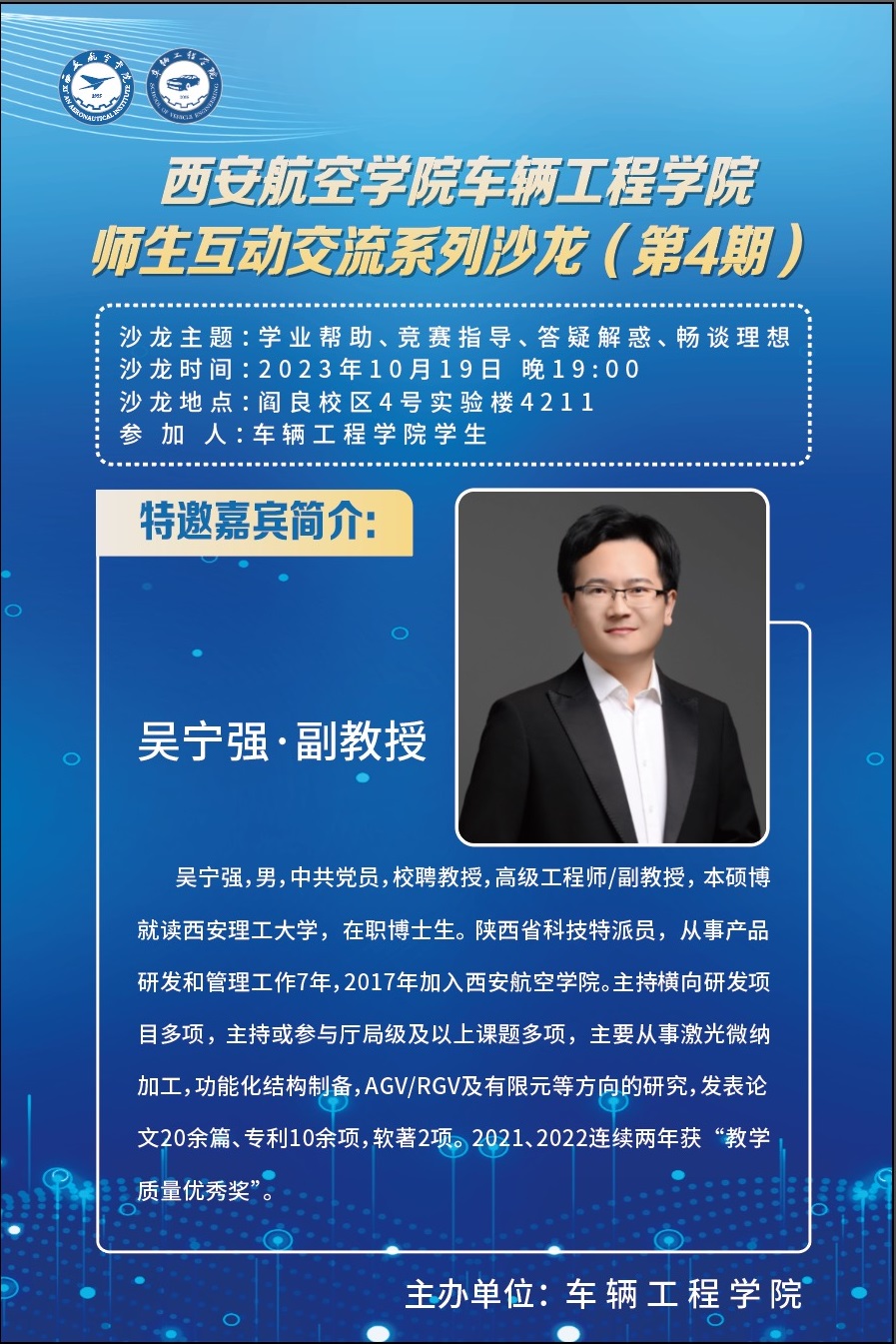 吴宁强,副教授,毕业于西安理工大学,在职博士生,陕西省科技特派员,从事产品研发和管理工作7年,2017年加入英国上市公司365。主持横向研发项目多项,主持或参与厅局级及以上课题多项,主要从事激光微纳加工,功能化结构制备,AGV/RGV及有限元等方向的研究,发表论文20余篇、专利10余项,软著2项。2021、2022连续两年获“教学质量优秀奖”。(文、图/车辆工程公司 赵坤 杜月怡 审核/周小勇)