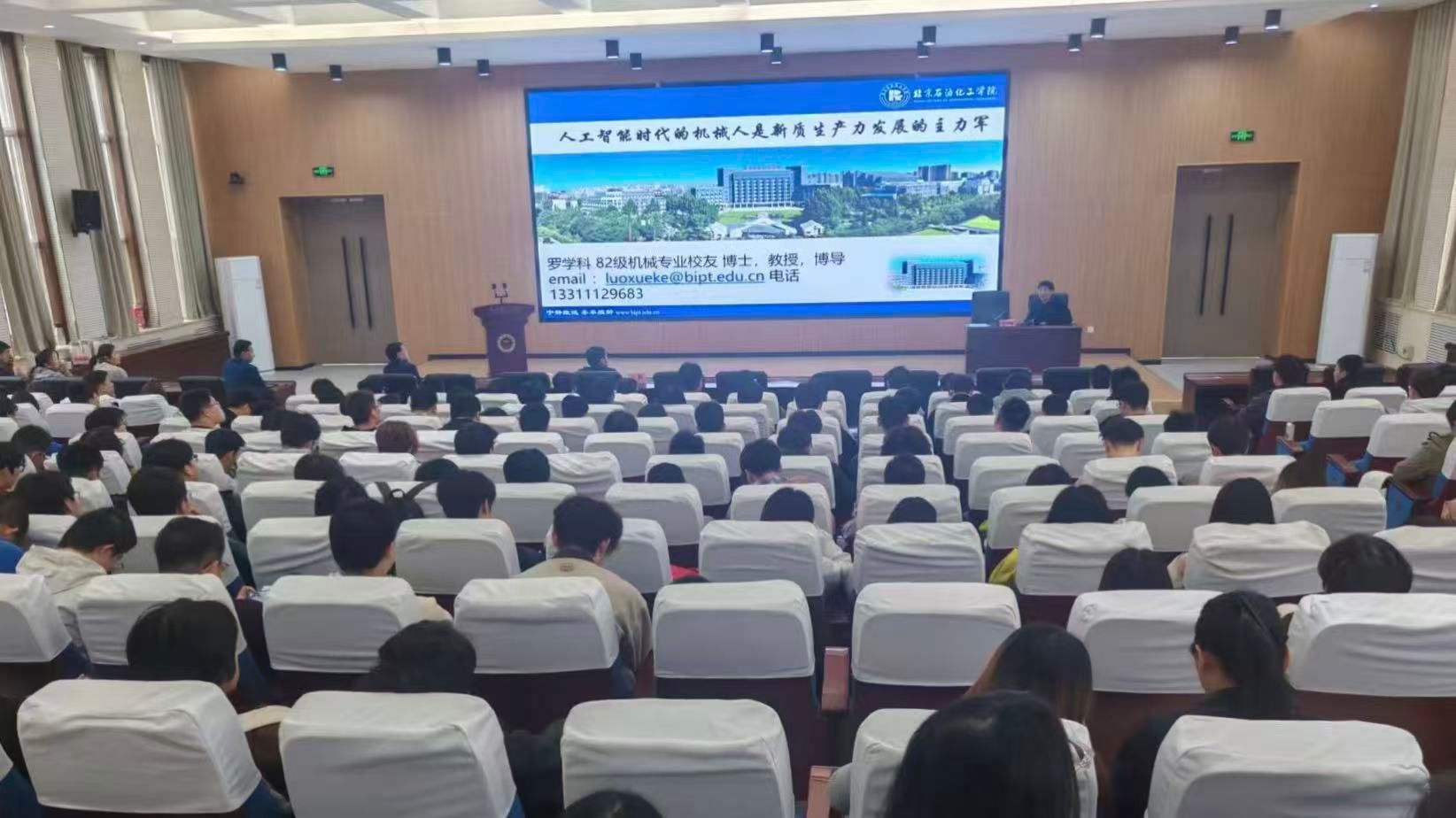 2026年4月2日下午,为发挥优秀员工榜样作用,激励学子成长,公司特邀1986届机械加工专业杰出员工、前北京石油化工公司董事长罗学科返校,开展“人工智能时代的机械人是新质生产力发展的主力军”专题报告。报告会由公司宋文学副董事长主持,公司党委书记吕毅、经理王永锋、副书记刘欣等教职工及300余名员工代表到场聆听。