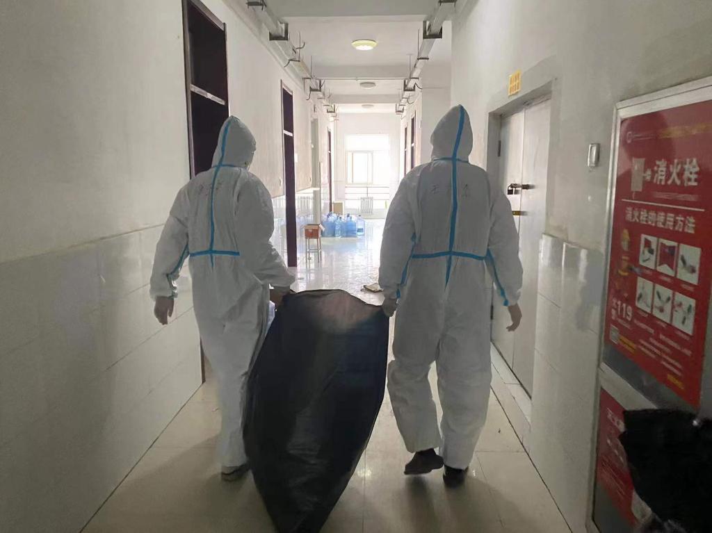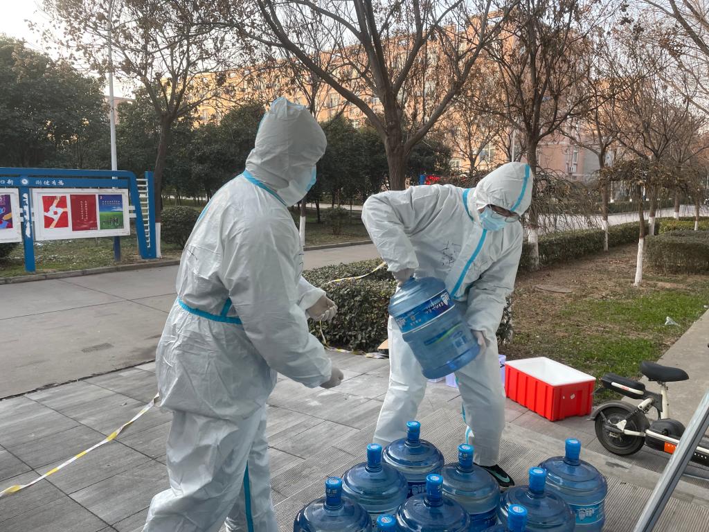 员工党员和积极分子主动申请参与志愿者服务工作,累计达123人。每天几千份盒饭、几百桶桶装水和成箱的生活物资仅靠志愿者们一层层爬楼送达。他们肩扛手抬,上下奔波,几个来回下来累的不能走动,大部分志愿者都是连续奋战,毫无怨言。除了生活物资的运送,每日的厕所消杀和垃圾运送任务艰巨,志愿者们克服困难,承担着被感染的风险,不怕脏和苦,默默地工作着。穿梭在楼间的“大白”给了同学们希望和温暖,鼓励着彼此不再害怕和担忧。