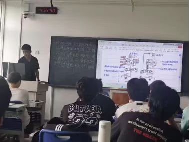 随后,路传浩聚焦顺序动作回路,通过“原理讲解 + 案例拆解”的方式,帮助同学们掌握回路设计的核心逻辑;张策则针对锁紧回路的关键要点展开深入剖析,厘清不同工况下的应用技巧。王帅更是以挖掘机液压系统为鲜活案例,生动演示实际作业中各阀门的操作原理与核心元件的功能作用,让抽象的理论知识变得直观易懂,有效打通“理论学习”与“实践应用”的衔接壁垒。