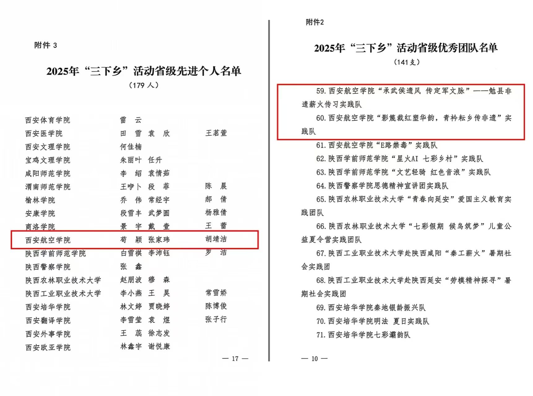 其中“承武侯遗风传定军文脉”一一勉县非遗薪火传习实践队与“影篾裁红塑华韵,青衿耘乡传非遗”实践队获得2025年“三下乡”省级优秀团队,苟颖、胡靖洁荣获2025年“三下乡”活动省级先进个人称号。