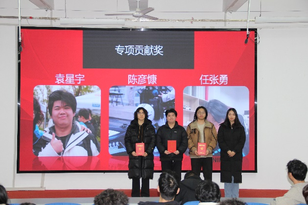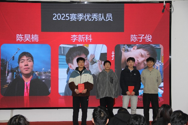 在颁奖环节,对赛季中表现突出的个人进行了表彰。陈昊楠、李新科、陈子俊获“优秀队员”称号;陈彦慷、袁星宇、任张勇获“专项贡献奖”;指导老师熊沂铖被授予“十年薪火——功勋指导奖”。现场掌声不断,气氛热烈。