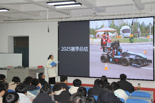 随后,队长任梦琳通过图文与视频相结合的形式对本赛季进行总结,全面回顾了车队2025赛季的参赛历程、技术创新与团队协作情况,客观分析了当前存在的不足,明确了未来改进方向,为后续工作提供了重要参考。