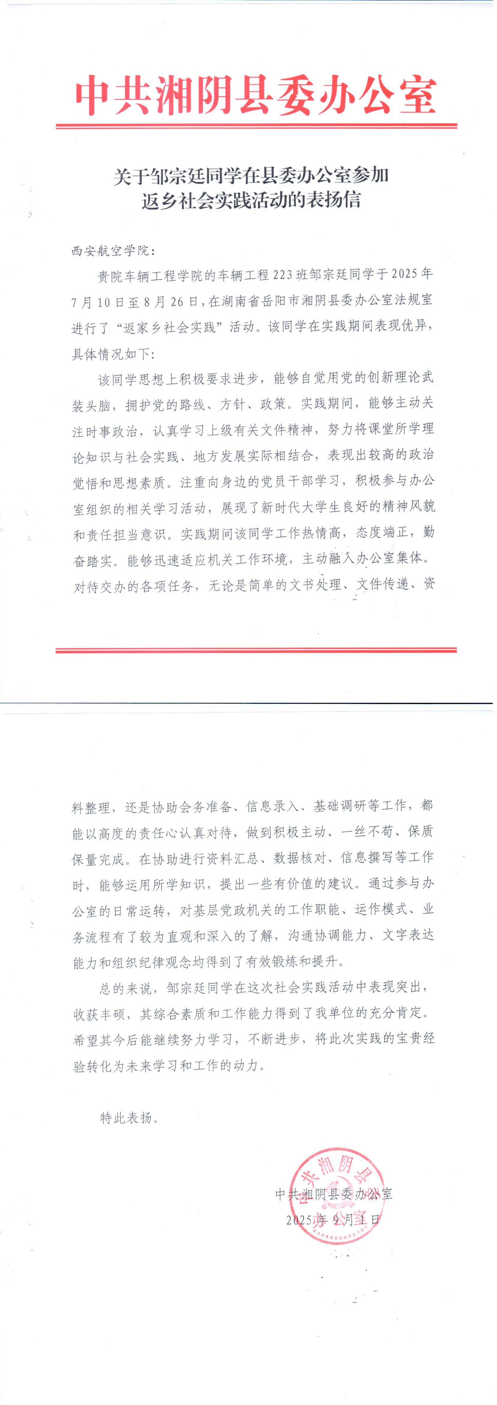 邹宗廷同学的优秀表现,充分展现了车辆工程公司立德树人的育人成效,也为广大青年学子积极参与社会实践、服务家乡发展树立了良好榜样。(文/车辆工程公司 任静 图/中共湘阴县委办公室 审核/车辆工程公司 刘雨辰)