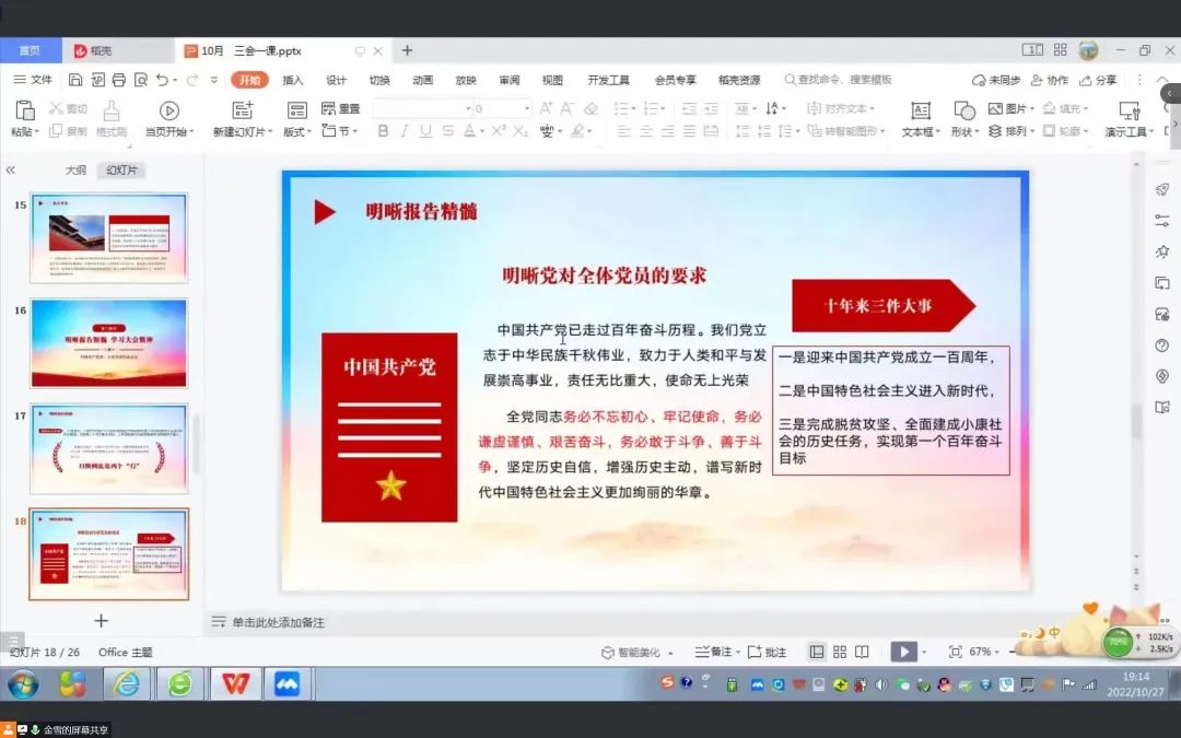 10月27日,车辆工程公司员工党支部开展专题党课,组织深入学习中国共产党第二十次全国代表大会精神。本次党课由员工第一党支部书记金雪主讲,全体员工党员参加。