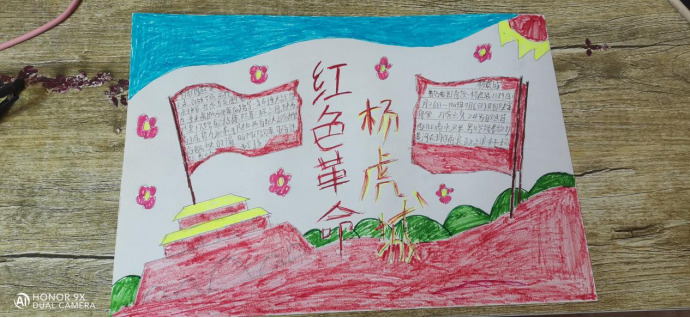 学习结束后,队伍中的少先队员有感而发,创作出的一份杨虎城将军英勇事迹的手抄报。