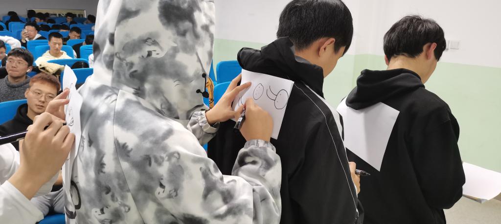 本次活动共有七组队伍,每组五位同学。游戏开始,每位同学将自己的纸片放于前面同学的后背上,裁判将已知题目图片告于第一位同学并由他画出,第二位同学根据自身感觉判断图片并传给第三位同学。以此类推,第五位同学画出的图片将作为每组的最终作品进行评比。经过最后的角逐,本次比赛前三名依次是来自汽服211、车辆211、新能源212的队伍。