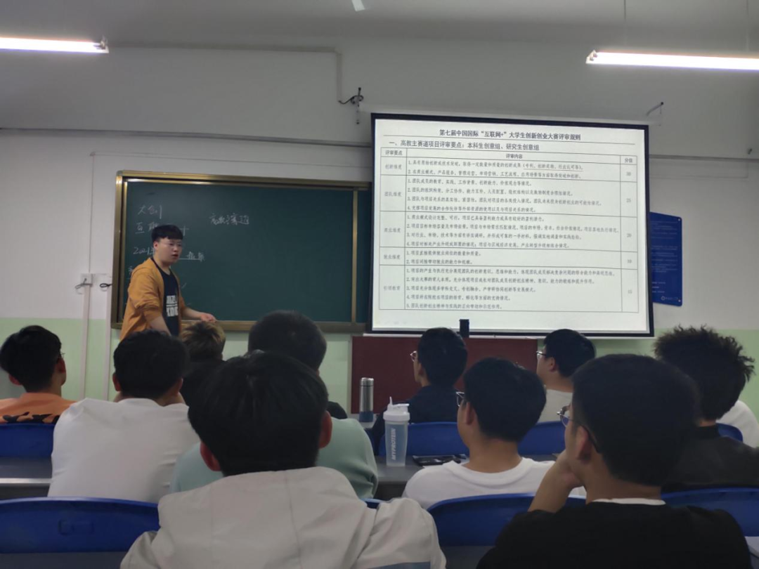 活动伊始,王鹏翔重点向大一同学们讲解了“互联网+”与“大创”的区别,为同学们讲述了公司历年成功申报的“互联网+”项目的亮点,帮助同学们对“互联网+”有一定的了解。接着,王鹏翔向大家介绍了第七届中国国际“互联网+”、老员工创新创业大赛评审规则,并详细介绍了各种比赛的组别,使同学们了解了“互联网+”项目的大体框架及评审规则。