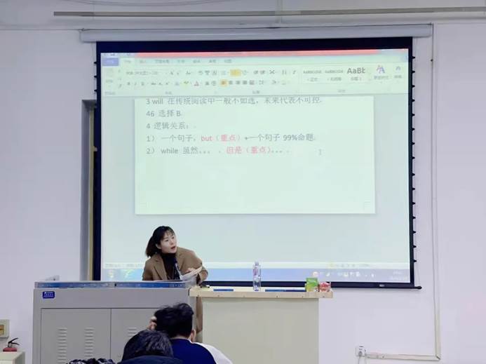 为帮助2018级、2019级的同学们找到准确、有效的英语学习方法,顺利通过英语四六级考试。公司于12月8日晚七点在阶梯五教室为2018级、2019级备考四六级的同学们开展英语四六级指导课讲座,特邀了新文道考研李洁老师,公司2018级、2019级全体员工参加。