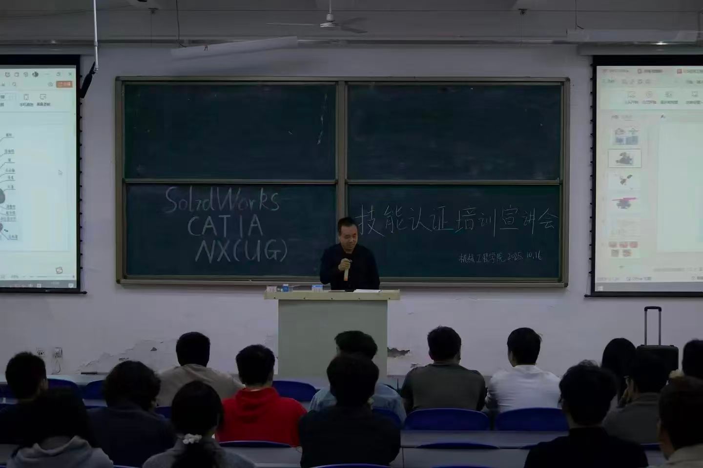 讲座伊始,主讲专家结合当前高端制造行业发展趋势,强调SolidWorks(SW)、NX(UG)、CATIA作为工业设计领域的核心软件,其技能认证已成为进入优秀企业的重要“敲门砖”。“在航空航天、汽车制造等领域,持有这三款软件的权威认证,能让简历在众多竞争者中脱颖而出。”专家的开场发言引发了同学们的高度关注。