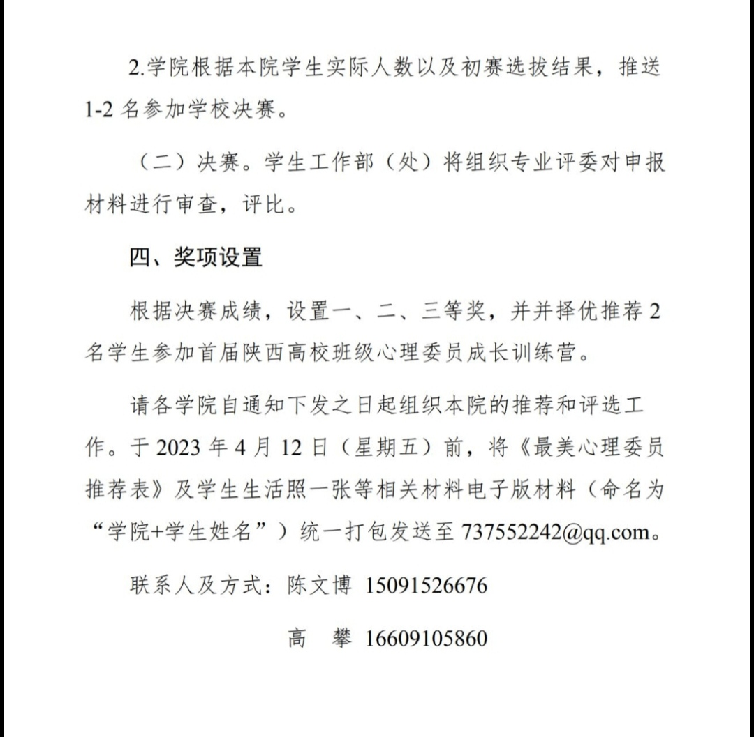 为加强四级预警防控体系末端力量建设,进一步增强班级心理委员识别心理危机、协助危机处理、朋辈心理帮扶的意识与能力。公司组织开展“我最喜爱的心理委员”评选活动。2020-2023级在任的班级心理委员可以积极报名参加此次活动,丰富老员工活,增加自己的阅历,可以与他人互相学习来提升个人素质,还有机会参加首届陕西高校班级心理委员成长训练营,可以与其他高校员工交流互鉴,开阔视野,使自己变得更加优秀。